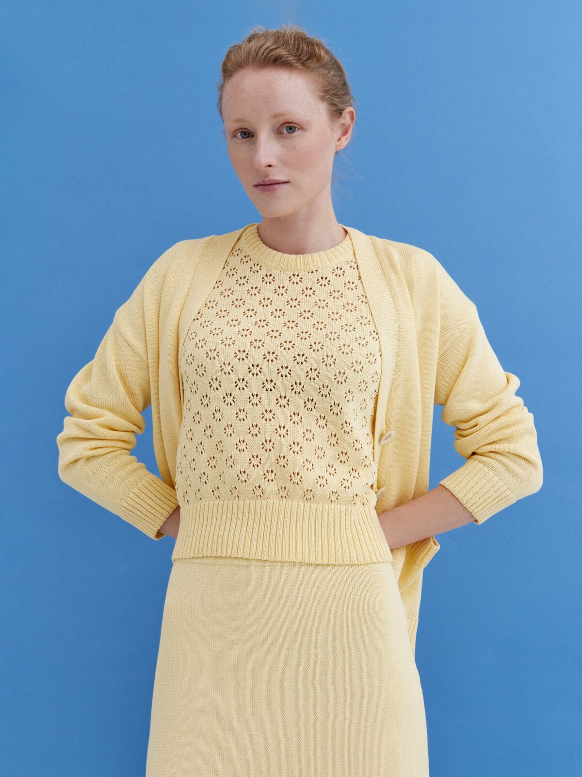 Knitted Cotton Lace Top and Skirt Set in Sun